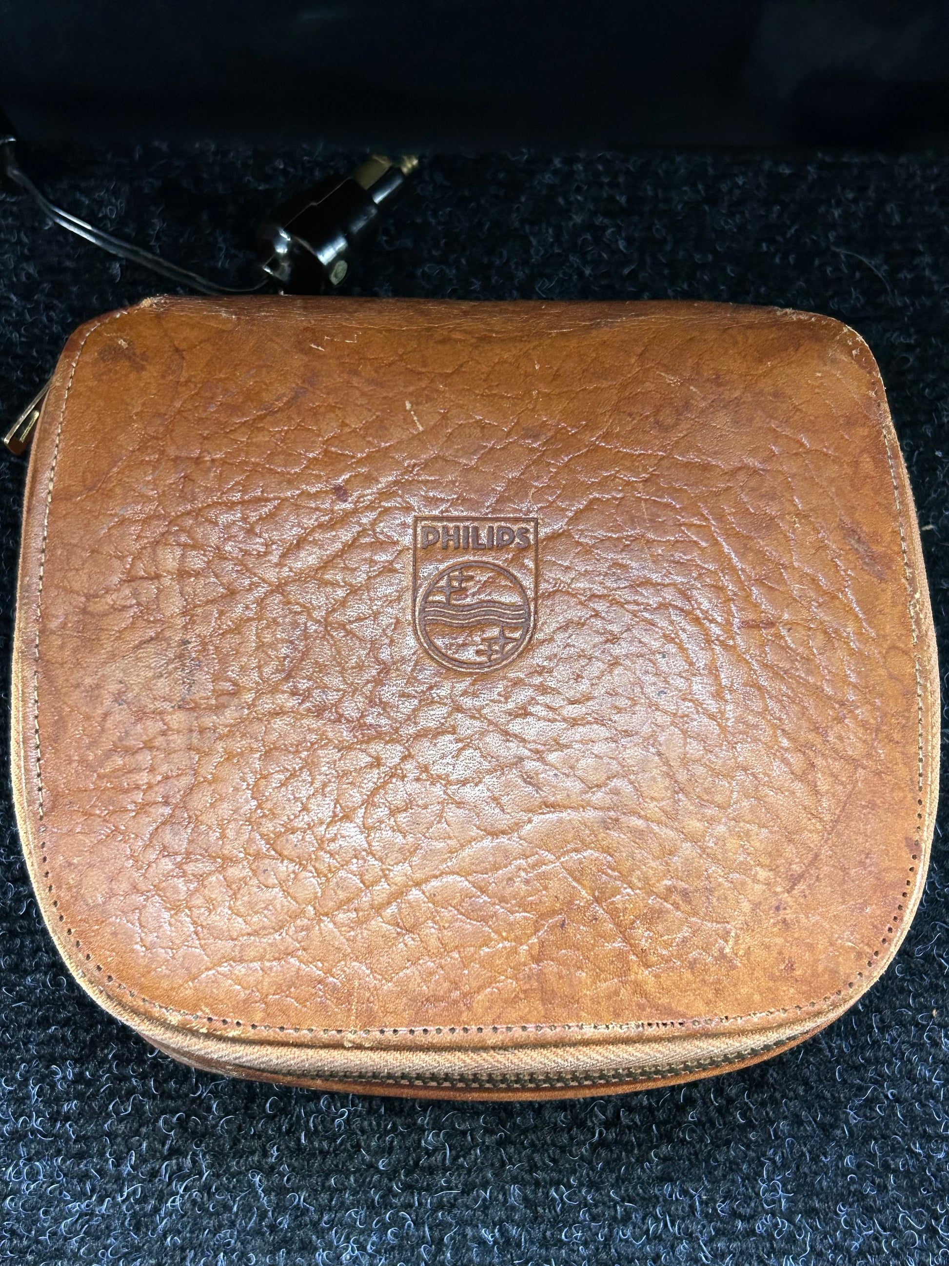 Vintage Phillip's shaver model SC7749. This travel shaver comes with the mirrored battery box. The box has a stand so it can be propped up for easier viewing into the mirror. The shaver is made of red bakelite. Also included are the cigarette lighter adapter and matching cleaning brush. Everything fits nicely into the zippered leather case which is also marked Phillips. The case has a plaid lining. The shaver looks to have never been used. The case has a couple scuffs and imperfections, but they are barely noticeable.
